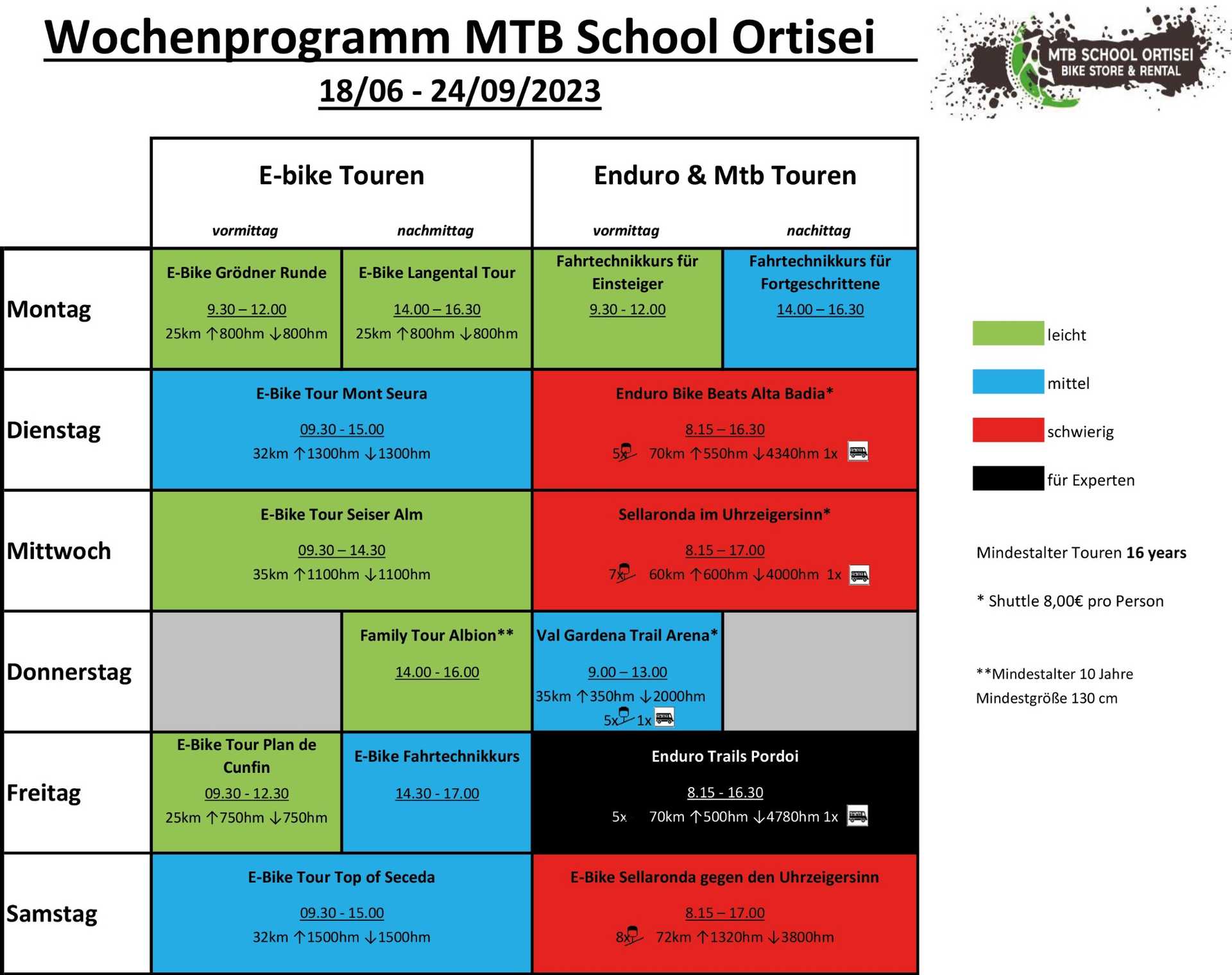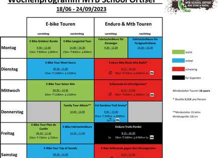 - Täglich kostenlos geführte Mountainbike Touren in mindestens 2 Schwierigkeitsgraden mit unserem "Albion Bike-Guide Team" der MTB Schule St. Ulrich (Easy Rider/Power Rider/Enduro Rider), inklusive hochwertiger Mountainbikes.