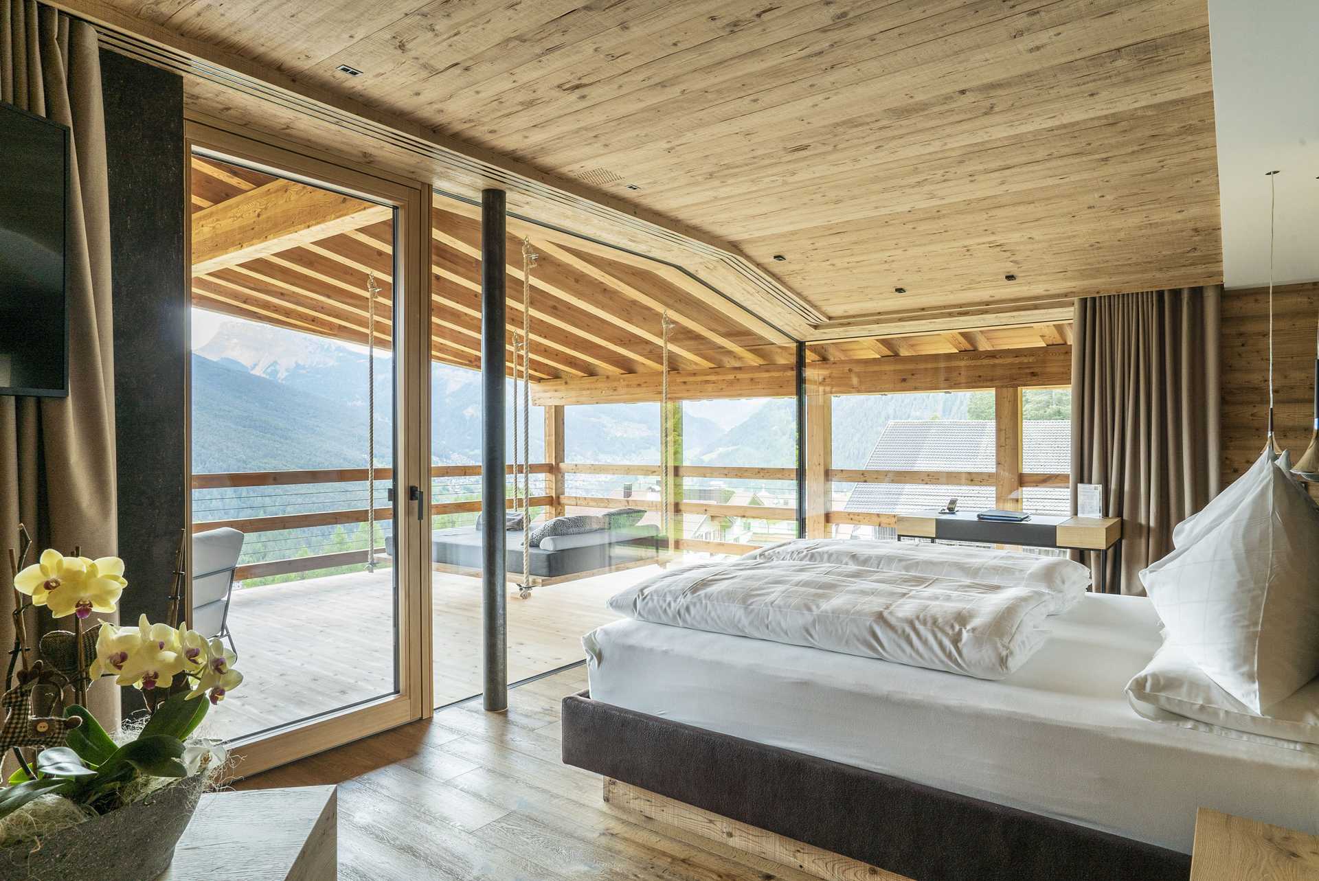 Luxus-Suiten auf 45 m² mit eleganter und nachhaltiger Bio-Naturholzausstattung, großer Panoramawand, 20 m² Outdoor Living Room, komfortablen Lounge Möbeln mit atemberaubendem Blick auf das gesamte Grödnertal und seinen majestätischen Bergspitzen.Kostenloser 100 M/b Glasfaser-Internetzugang, kuschelige Entspannungsecke, Klimaanlage, Sat TV, Radio, Telefon, Tresor. Für Familien sind ein drittes und viertes Bett in der trennbaren Kuschelecke möglich. Elegantes Badezimmer mit großer Relaxdusche, doppeltes Waschbecken und getrenntes WC.Ein großzügiger Garagenplatz im Chalet ist inklusive und es gibt eine direkte Verbindung zu den Räumlichkeiten des Hotels.