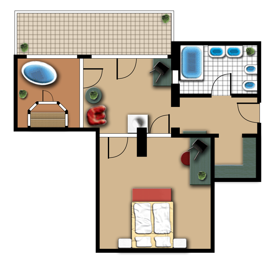 Suite equipped with shower, bathtub, WC and private infrared sauna, balcony, sitting area, walk-in wardrobe, satellite TV, Radio, direct dial telephone, internet connection, mains circuit breaker, safe, hairdryer, minibar, possibility of 3rd and 4th bed, beautiful panoramic view of Val Gardena, underground car park included