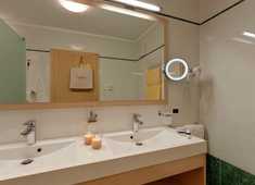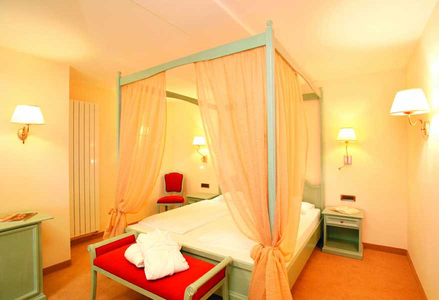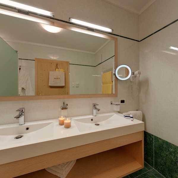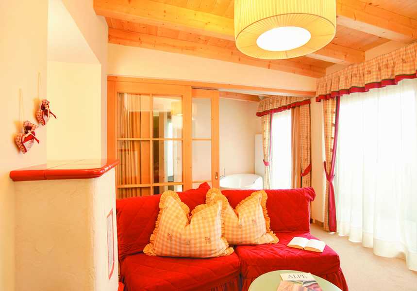 Suite dotate di doccia, vasca, WC, sauna a infrarossi privata, balcone, salottino, cabina armadio, TV satellitare, radio, telefono, connessione internet, disgiuntore, cassetta di sicurezza, asciugacapelli, frigobar, possibilità d’aggiunta del 3° e 4° letto, meravigliosa vista panoramica sulla Val Gardena, garage sotterano incluso