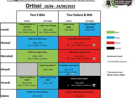 - Escursioni in mountainbike a partecipazione gratuita con almeno 2 livelli al giorno (Easy Rider/Power Rider/ Enduro Rider) con il nostro "Albion Bike-Guide Team" della Scuola MTB Ortisei.